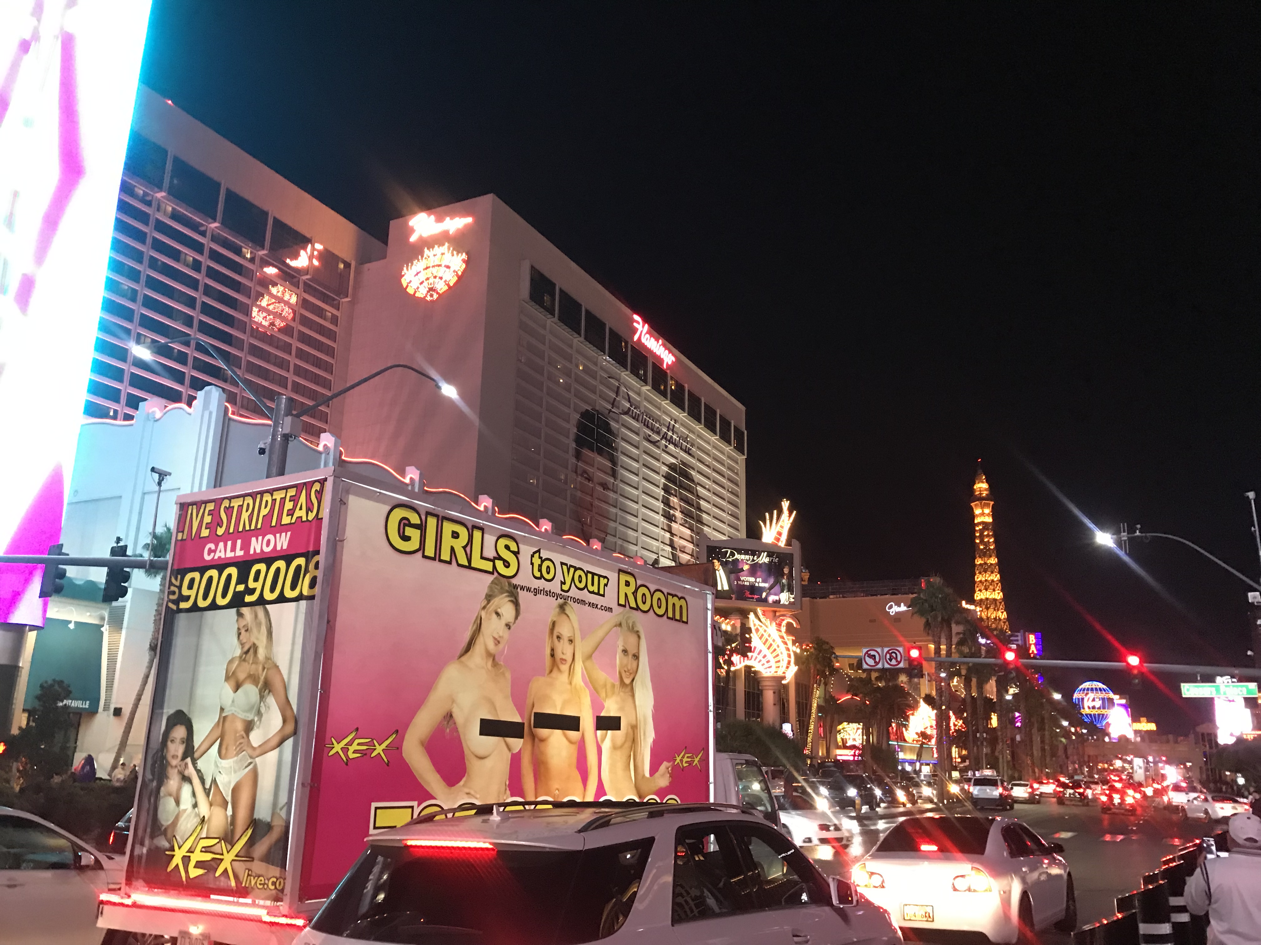Otra cosa que destaca son los continuos letreros y coches con paneles luminosos publicitando prostitución a domicilio.